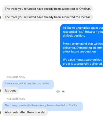 国家:美国 姓名:Kelly Yeang 邮箱:shelsbella16@gmail.com Facebook主页:https://www.facebook.com/profile.php?id=61553998670756 曝光原因和证据等: 第一次合作返款后,未经许可私自下单 ,下了五单,还威胁立刻返款,不返款给1星差评 支持曝光() 被冤枉了()